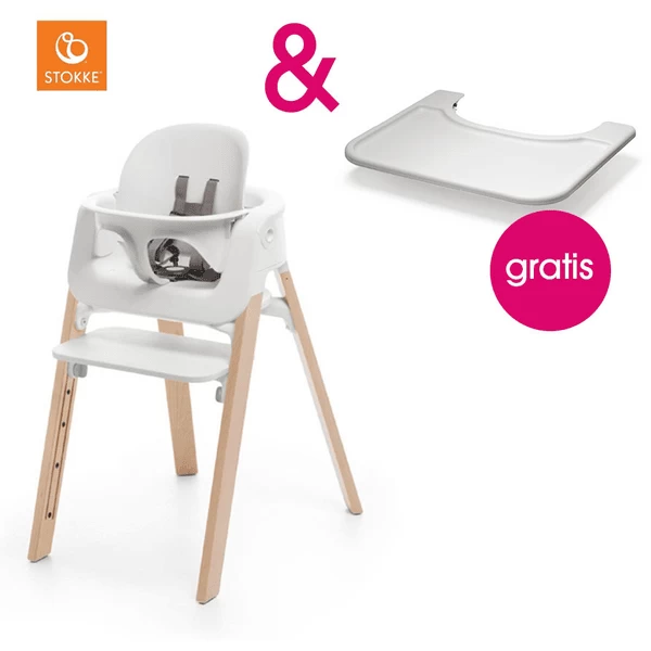 STOKKE® Steps™ Hochstuhl Weiß Buche Natur Inkl. Baby Set Weiß + Gratis Tray Weiß